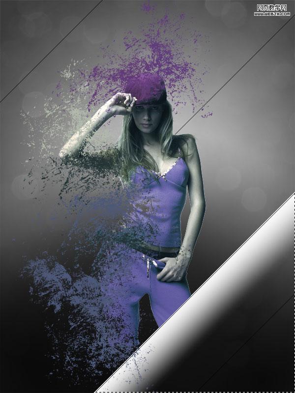现在要让图片看起来更好了,回到女孩图层去在图层蒙版的左边用grunge笔刷来添加一些黑色,看起来就像姑娘被涂掉了一块,我还顺便调整了一下腿部的边缘和角度。