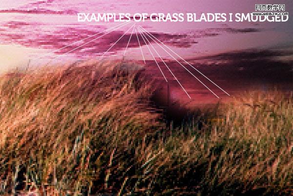 为了使两种效果更加融合,选择人物脚部的草,然后复制,新建一个图层,粘贴过来,然后我们用一个小的柔的画笔涂抹新图层的草,使用1px的涂抹工具降低草的透明度,最终使图像完全融合在一起。