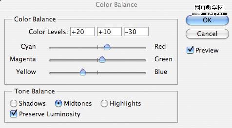 为了使天空和草地更好融合,我们调整色彩平衡,设置如下。