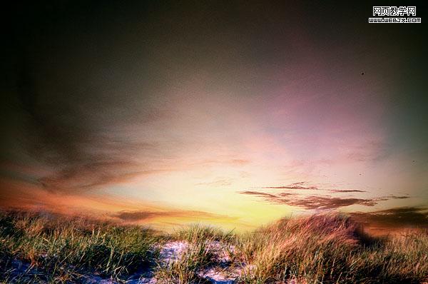 创建一个新图层sky gradient overlay,然后设置渐变效果,填充画布,然后降低图层透明度到50%,改变图层模式为叠加,效果如下。