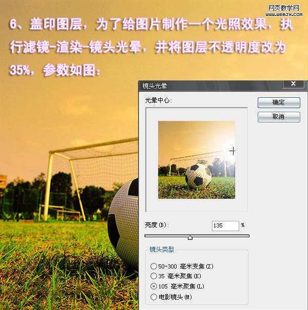 6、盖印图层,为了给图片制作一个光照效果,执行滤镜-渲染-镜头光晕,并将图层不透明度改为35%,参数如图: