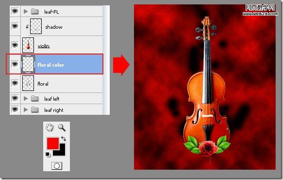 选好以后,复制并粘贴玫瑰花瓣,这层放在leaf—fr图层组上面,调整好大小,然后在把花放到小提琴下面,如下图: