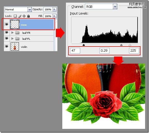 把这图层命名为:rose。打开色阶工具(ctrl+l),用色阶工具把花的颜色调的更生动一些,如下图。如果你对调解后的颜色不满意,你还可以用加深和减淡工具来给花增加阴影和高光效果,让它看上去更完美。