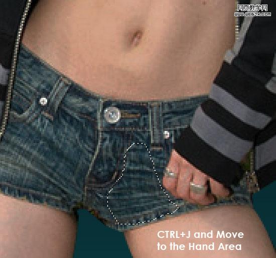 用套索工具选区一块牛仔裤面料 并且按ctrl+j 复制出来,然后将手覆盖!