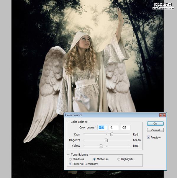 转到图像“调整”色彩平衡和使用下面的设置(因使用的并不是原文中的翅膀素材,所以参数可以适当灵活调整)。 可以使用亮度/对比度 适当增强翅膀的敏感对比,必要的时候可以使用加深工具对局部阴影部分加深