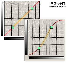 由于曲线是反映图像的亮度值,一个像素有着确定的亮度值,可以改变它使它变亮或变暗。观察以下两张图,水平灰度条代表了原图的色调,垂直的灰度条代表了调整后的图像色调。在未作任何改变时,输入和输出的色调值是相等的,因此曲线为45度的直线,这就是曲线没有变化的原因。当你对曲线上任一点做出改动,也改变了图像上相对应的同等亮度像素。点击确立一个调节点,这个点可被拖移到网格内的任意范围,是亮是暗全看你是向上还是向下。亮度值改变的突然,会造成非常夺目的效果;缓慢的逐步改变,则无论是提高还是降低亮度值,都会使色调过渡光滑,效果逼真。接下来的例子示范了当曲线上一些特定值被改变时,对图像起了什么样的作用,同时你可以清楚的看到曲线的形状改变。(为了显示效果,在这个例子里的曲线都有些夸张,某些时候你需要强烈变化的曲线,但大多数时候,图像曲线的改变要轻微得多。)