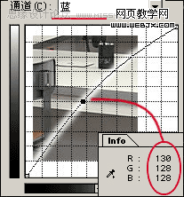 这里我们所指的彩色图像,是指rgb图像,不包括cmyk模式的图像。rgb图像可以被认为是由一个复合通道和三个分别包含一种颜色亮度值的灰度通道所组成的。如果你没有注意过这一点,那么打开通道面板,点击不同通道,你将会看到不同亮度的灰度图像。这样,你就可以像编辑灰度图像那样用曲线单独编辑每个通道了。对每个通道进行巧妙的调节,这在photoshop调整色彩的方法中是最为精确可靠的了。你完全可以跳过色彩平衡,也大可节省下色相/饱和度或是变化命令,因为我们有更好的! 当你在rgb模式的图像中调用曲线命令时,合成通道的信息将会出现在屏幕默认位置的信息栏中: