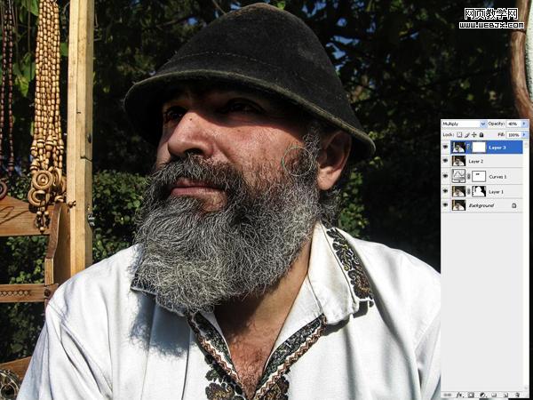 对色阶调整层的蒙版填充黑色,然后用(更低透明度的)白色小笔刷,画在胡子、衣服、和木头的一些部分,使之提亮。
