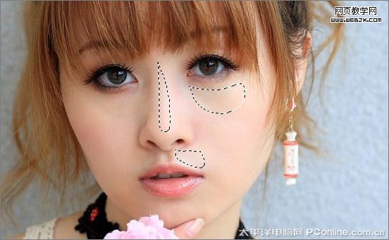 鼻梁是最重要的(鼻梁的光更能体现出人物的精致) ,先用索套工具扣画范围,右键羽化(羽化的数值根据图片的大小来调试),一般5~10左右。