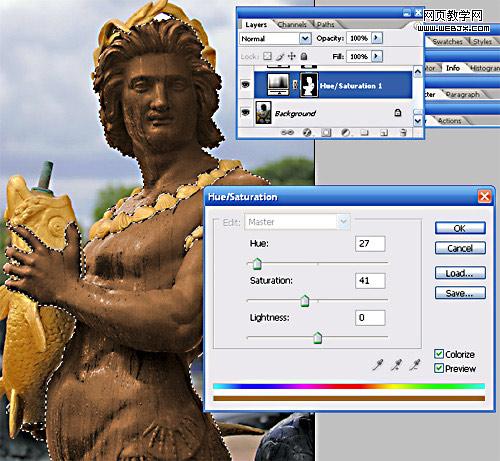 首先打开原图,然后我们使用选择工具把人物石像部分选择出来,然后调色,建立一个色相/饱和度调整层,设置如下。