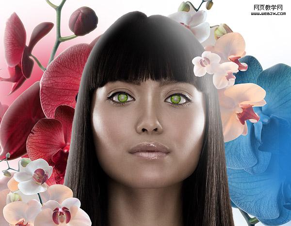 复制红色的兰花,把它们移动到另一边。通过调节图层改变它们的颜色,在顶部添加蓝色的光晕。