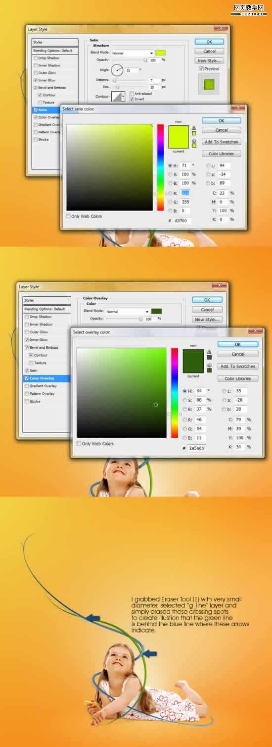 让我们按照步骤9的过程做。这个新线条将穿越蓝线,我们会用绿色填补它。创建一个新图层在“蓝线”之上,名称是“绿线”。创建一个新层,命名为“g _line”。用画笔工具(b),改变直径尺寸为6 - 8px,设置硬度及流量为100%。下一步使用钢笔工具(p)画一条好的路径穿过蓝色的线,然后单击鼠标右键,选择描边路径。这种应用产生的效果和之前一样,合并斜角和浮雕的阴影。这次所有的选择都用绿色。当你完成时,用橡皮工具(e)确保“g _line”层被选中。然后擦除两条线交叉的部分,加一些深度。你也