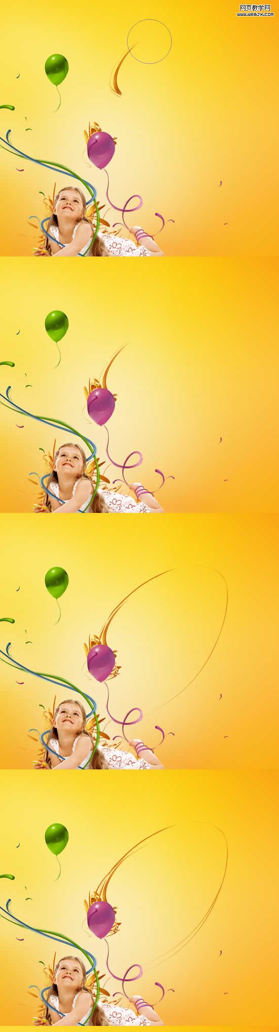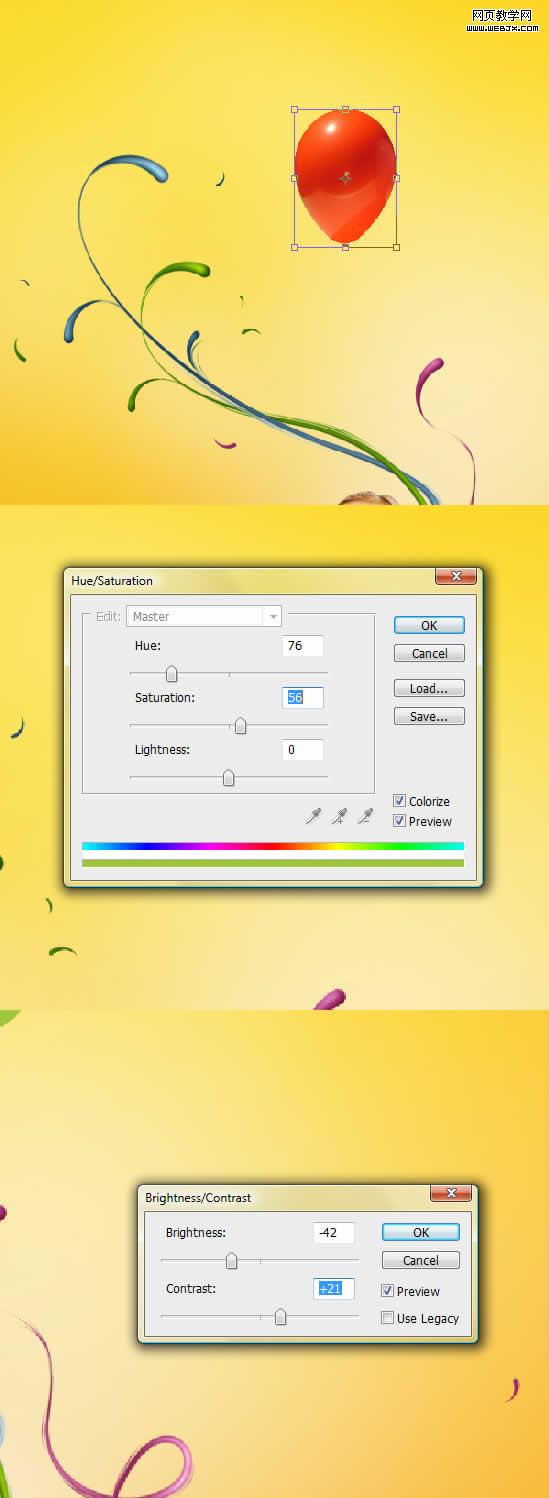 ok,背景看起来好极了,显得有深度而且平衡。现在我们可以更进一步。打开气球图像,用魔棒工具(w)提取它。我们利用这个工具很容易提取气球。这可能要在之前裁剪,保存在白色的背景上。把它变成你的主要项目,调整大小,水平翻转(用编辑>变换去做)。重命名它为“绿色气球”,运用一些颜色调整。你可以