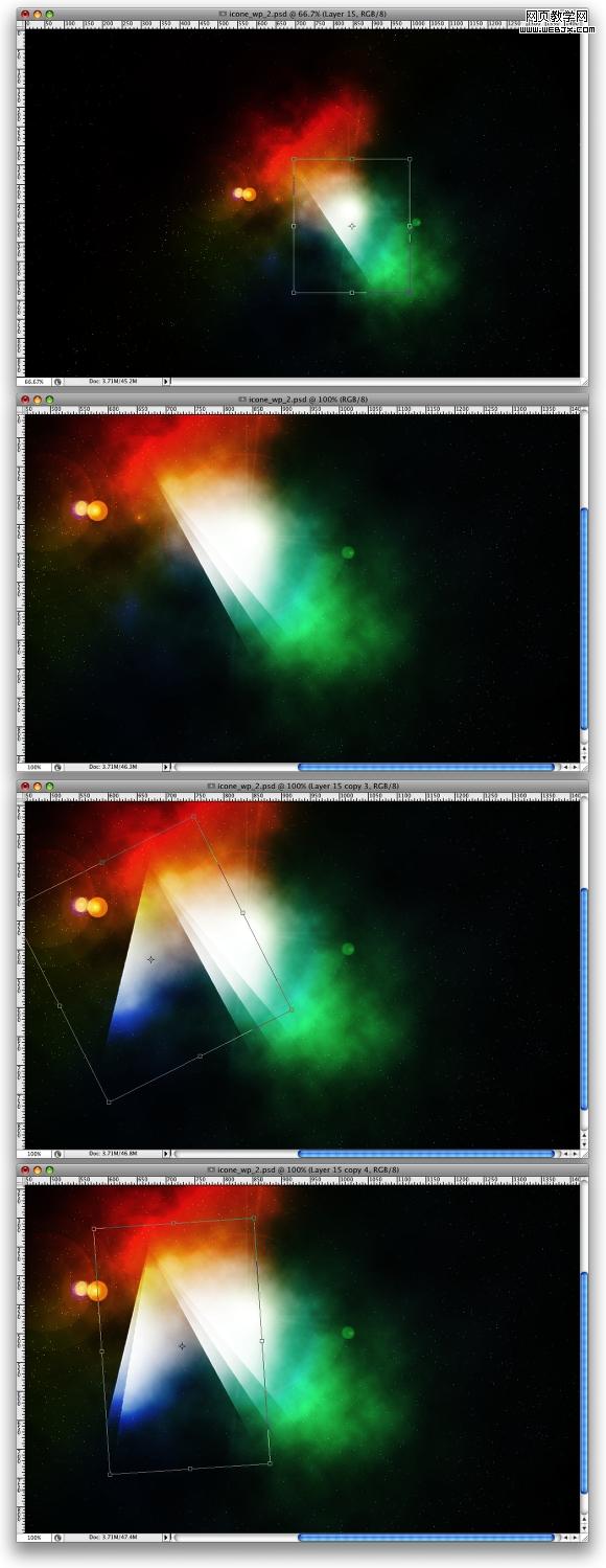 现在就是有关复制,调整和旋转的内容了。这里要转换原始射线光芒层为智能物体,你就可以在不破坏图像的条件下调整和旋转了。之后你创建一个“a”,改变混合模式的元素为屏幕,用80%的不透明度。