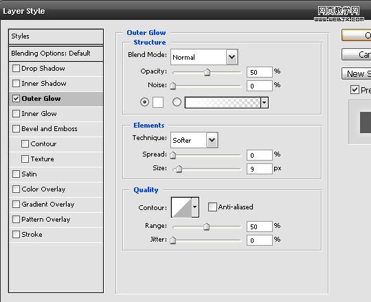 第十二步:选择图层样式>外发光(柔光)>内发光>描边