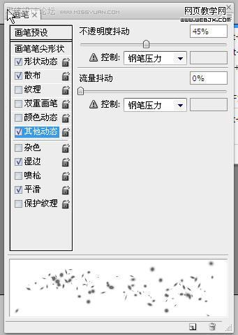 5、按快捷键ctrl+j,创建“图层3”,选择“画笔工具”,将笔尖设置为“柔角9相素”,按f5,打开画笔面版,依次设置“画笔笔尖形状、形状动态、散布、其它动态”,打开“湿边”和“平滑”效果。具体设置如下: