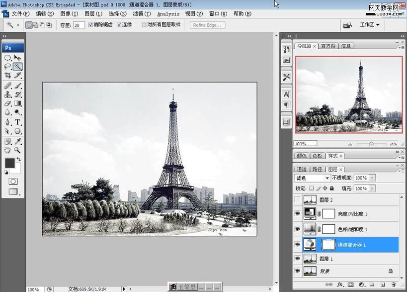 4、选取“通道混合器”调整图层,将“混合模式”改为“滤色”,出现彩色效果。