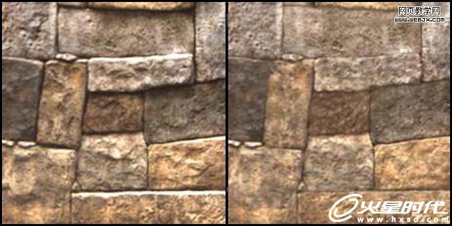 如下图所示,我们先看如何手动擦除材质中的光照效果。左边的是琢石块的照片。当在3d场景中打上灯光后,这样肯定会出现穿帮,特别是场景光源方向跟素材光源方向完全相反时尤为明显。最佳的方法是你应该使用置换贴图作用在模型上产生形变进而得真实的阴影效果,而不是依靠材质本身。