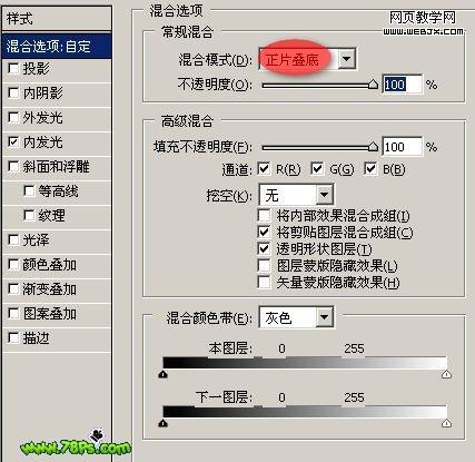 3.现在显示副本图层(点击图层缩略图前面的眼睛),添加以下图层样式(图层--图层样式--混合选项),混合模式同样是正片叠底