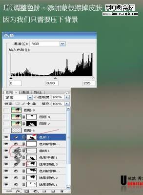 11、创建色阶调整图层,参数设置如下图,确定后用黑色画笔把皮肤部分擦出来。