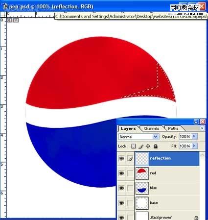 五,切除一半来,现在被选择的一半还在,使用退格键来删除选择的部分,现在你应该有一个白色的base图层和一个红色的半圆图层。接下来,我们制作蓝色的半圆,选择前景色,然后,选择暗蓝色,把red图层拖到新建图层按钮上复制一层,命名为blue,按住ctrl键,在蓝色层上单击左键,然后按alt+退格键填充蓝色。选择编辑->变换->垂直翻转。