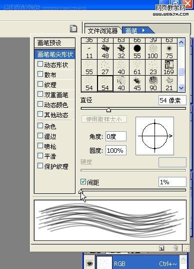 选编辑→定义画笔,名字为“毛发”。接下来选画笔工具,模式为“正常”,在“画笔预设”窗口里把“间距”设为