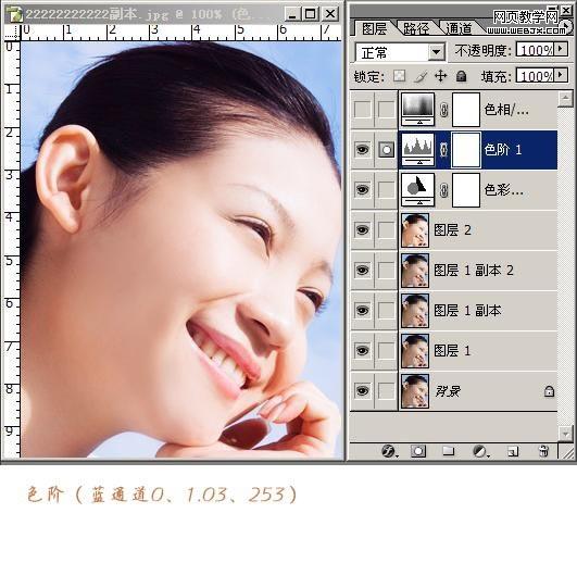 6、在菜栏中的图像——新调图层——色阶,通道:蓝,输入色阶:0,1.03,253。