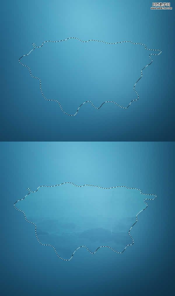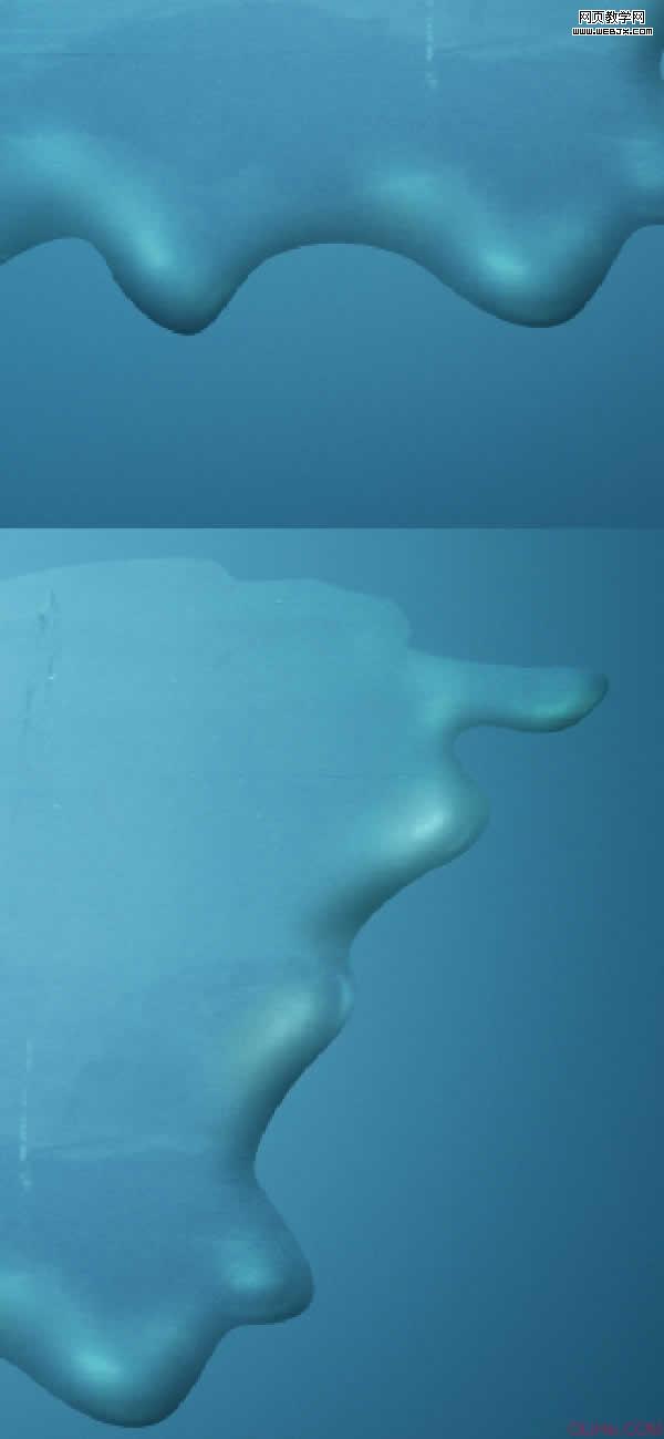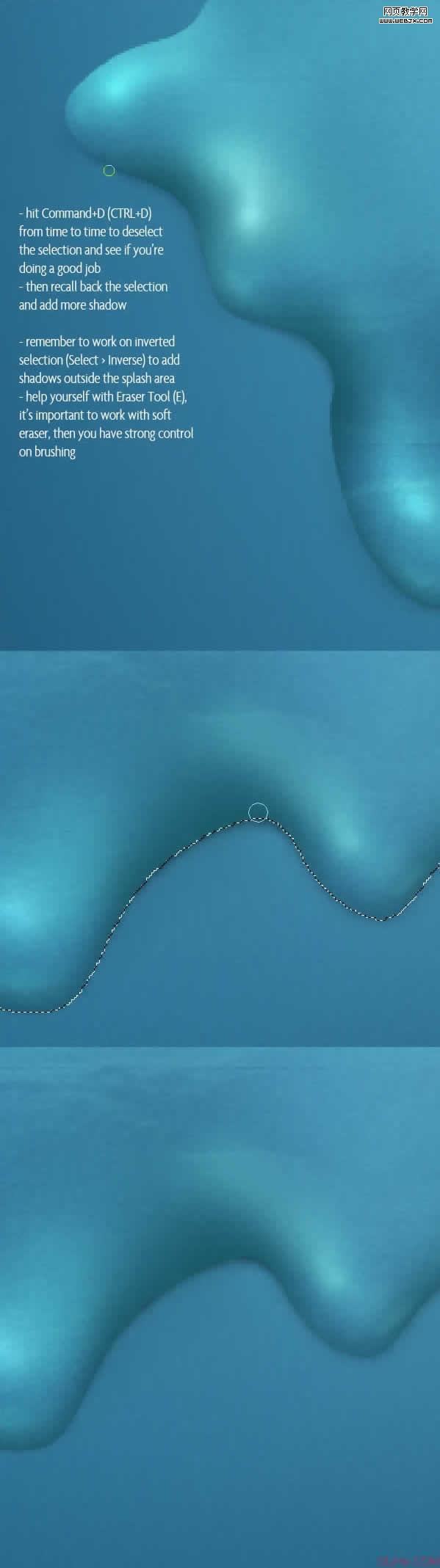 现在在所有层之上创建一个新图层,其命名为“splatter shading”(飞溅的阴影),使用画笔工具(b),改变颜色为#125361。确保你的画笔设置非常柔软,硬度0%,流量10%。现在在纹理层上做一个选区(command-click图层的缩略图)。看看下图3,涂抹在指定的地点。我们需要变暗这一飞溅的内边缘,创建一个凸面的视觉效果。这个飞溅需要突出一点,不能太平坦。请参阅下图4和图5。