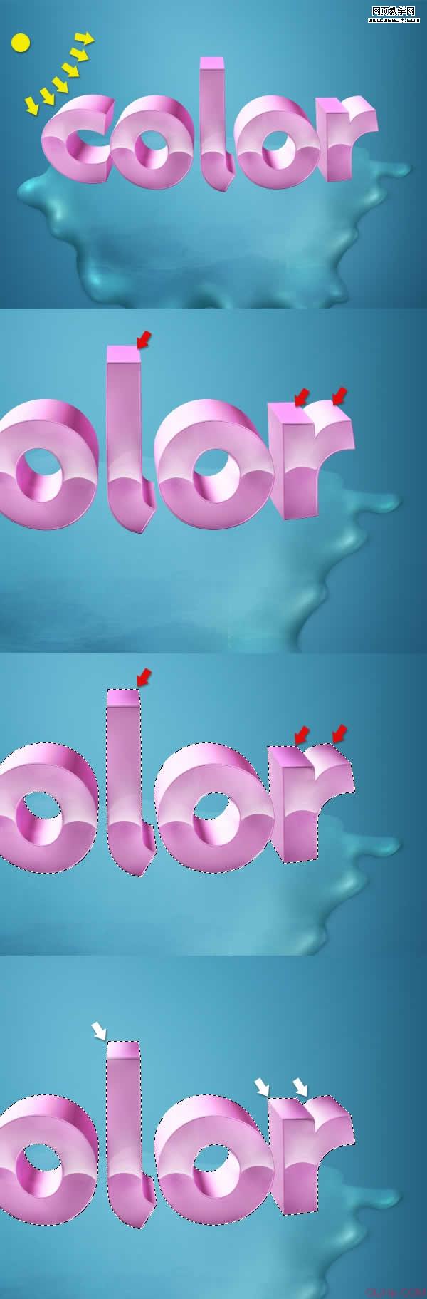 因此,创建文本选区(下图3)。使用与之前相同设置的笔刷工具(硬度0%,流量5%),更改颜色为一些较暗的粉红色(# 79185d)。在所有图层之上创建一个新层,命名为“additional shade”(额外的阴影),开始在这些字母顶部的右上方涂抹,参照下图3。