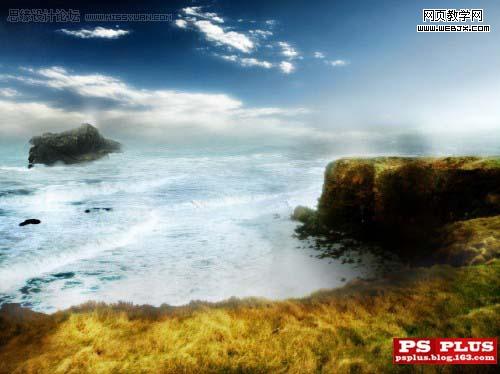 31、为了给图片添加一些情趣。我们可以再岸边的悬崖上添加一个美女。让她注视着远处的风景。使用我前面提到的美女素材。把她放到合适的位置。