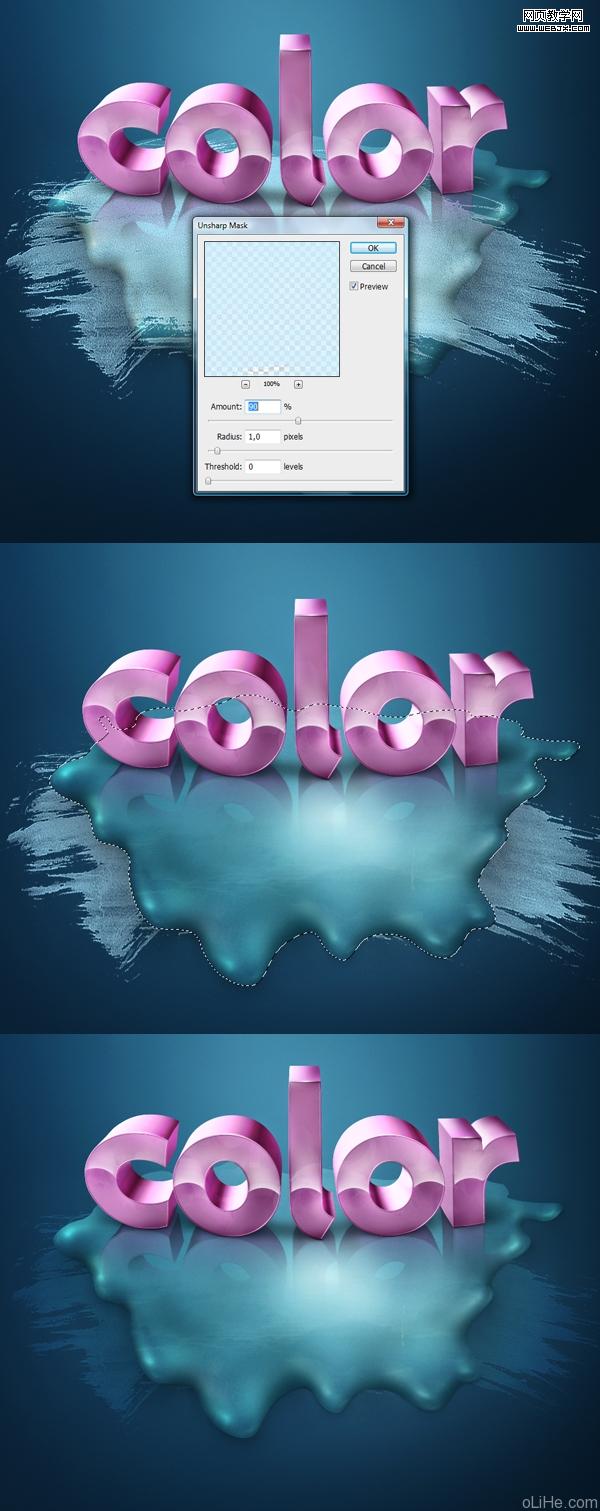 在做之前第一个需要注意的是在飞溅阴影之下创建一个新图层组。然后打开下载的笔刷包,选择一个大的污点笔刷(笔刷如下图1)。创建一个新层,命名为“brush”(笔刷)。使用#cceeff色,并将其设置在整个飞溅上。然后去滤镜>锐化>usm锐化,设置数量约为80-90%(下图1)。