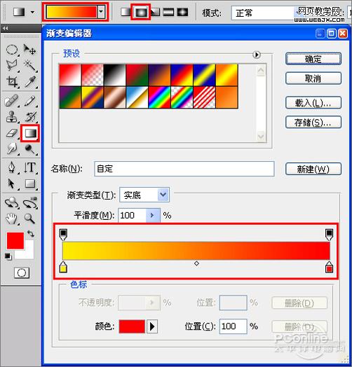 23、选择工具箱中的渐变工具,设置渐变颜色为黄色到红色的渐变,渐变类型选择为:线性渐变,利用渐变工具在选区内拖曳出渐变效果,如图23所示。
