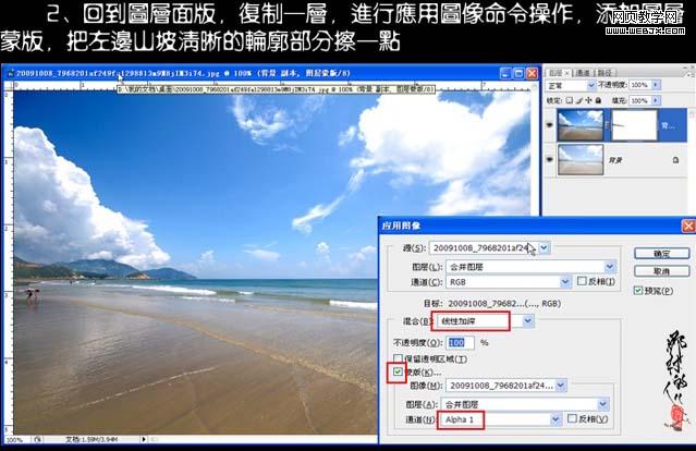 2、回到图层面板,把背景图层复制一层。执行:图像 > 应用图像操作,参数设置如下图。确定后加上图层蒙版,用黑色画笔把山坡清晰的轮廓部分擦一点。