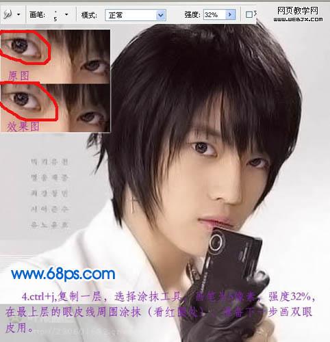4、ctrl+j复制一层,选择涂抹工具,画笔为5像素,强度32%。在最上层的眼皮线周围涂抹(看红圈处),准备下一步画双眼皮用。