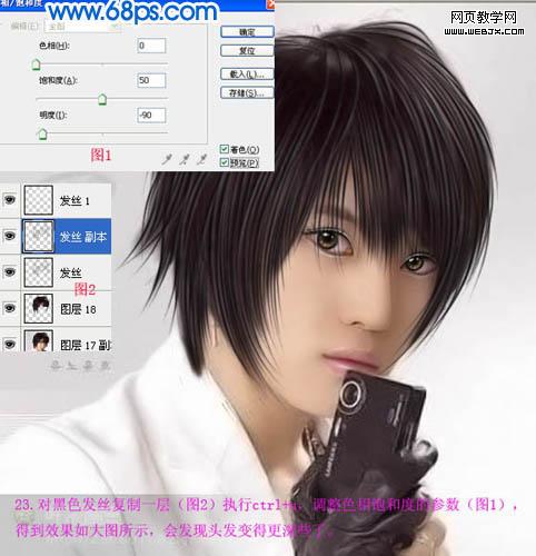 23、对黑色发丝复制一层(图2),执行ctrl+u,调整色相饱和度的参数(图1),得到效果如大图所示,会发现头发变得更深色些了。