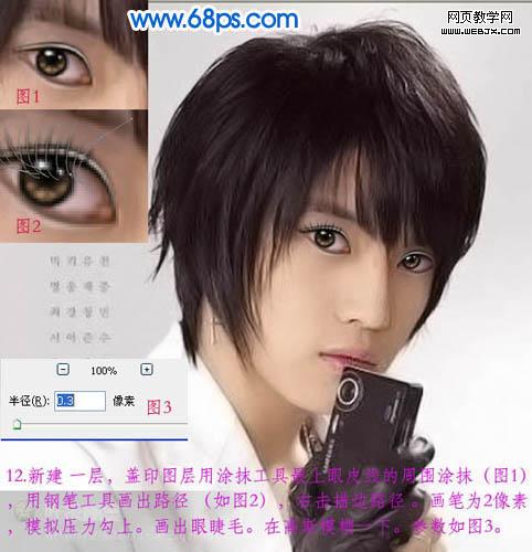 12、新建一层,盖印图层,用涂抹工具在最上层眼皮线的周围涂抹(图1),用钢笔路径画出路径(图2),右击描边路径,画笔为2像素,模拟压力勾上,画出眼睫毛,在高斯模糊一下,参数如图3。