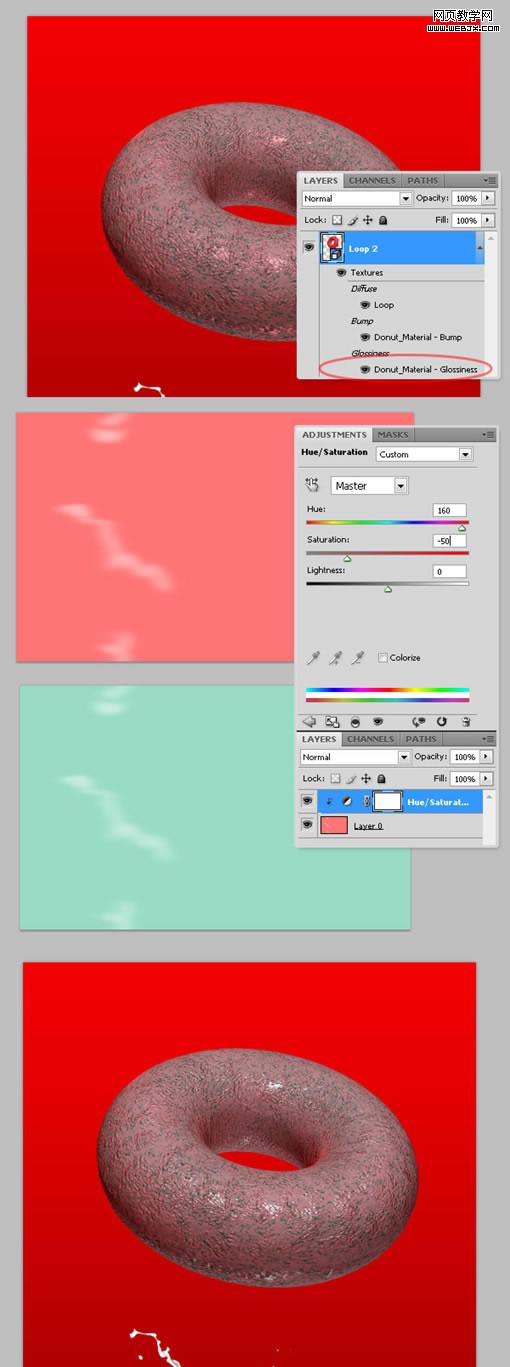 接下来,双击“loop2” 的光泽图层,你会看到我们在第十一步的纹理颜色。我们添加一层色调和饱和度调整蒙版来更改光泽的颜色。最终的颜色取决于你,但是请尽量与前面一步所使用的颜色保持相近。保存纹理文档再看一下现在看起来怎么样了。