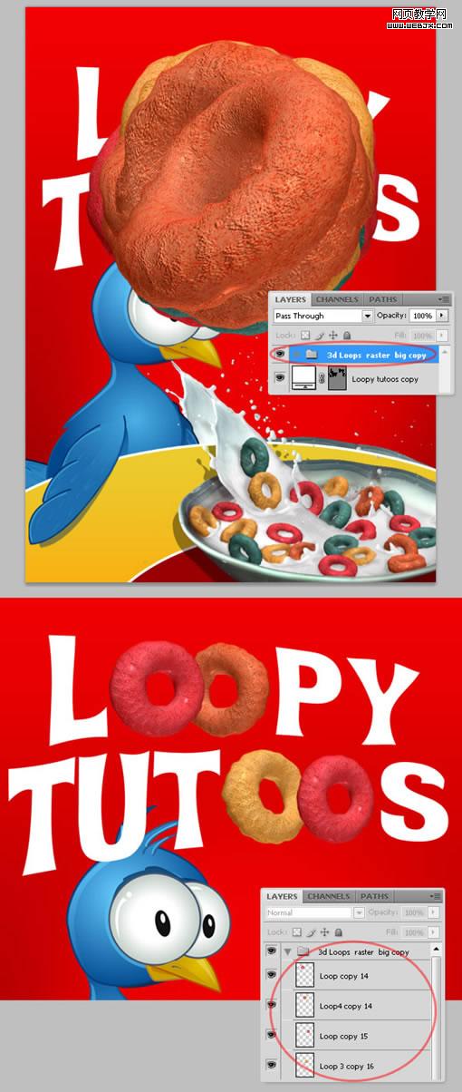 还记得第二十步中的“3d loops raster big”文件夹么?现在又到了用它的时候了,使该文件夹可见,将它复制并且将其置于最上层。然后选择4个甜麦圈,删去其他,然后用甜麦圈取代原来“o”的位置。