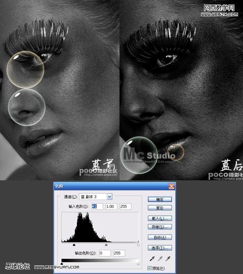8.盖印图层,打开通道面板,将蓝通道复制一层(按住蓝通道,往新建按钮上拖,记得复制不要在原图上处理),按ctrl+l,调色阶,示意图如下,全选蓝副本,复制,找到蓝通道,粘贴。效果为: