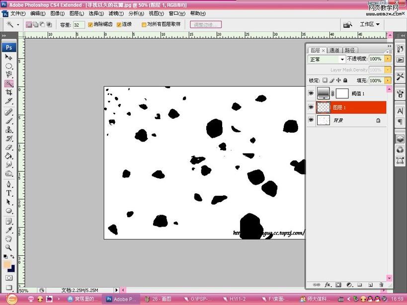 26.执行阀值-调至黑白分明,这样子可以将所要的花瓣跟背景分离开来。