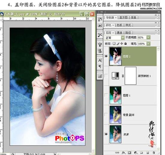 4、盖印图层,关闭除图层2和背景以外的其它图层,除低图层2的不透明度为82%。