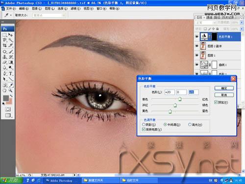 3、通过曲线提亮、色相饱和度以及色彩平衡的调整达到理想中的唇色,肉粉色与肤色非常吻和。同时整体的视觉重点也调整到眼部。