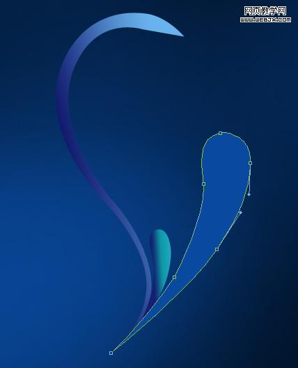 接下来我们就要来描绘形状了,使用钢笔工具开始绘制第一个形状的路径然后使用转换点工具,你可以调整路径线段如下图所示,颜色为#094a9f