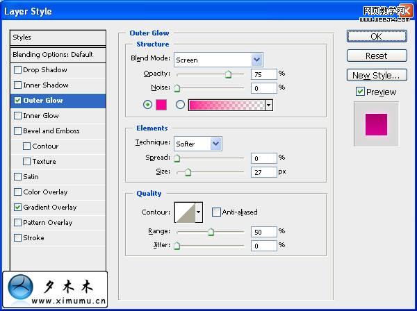 再添加个外发光,设置如图: