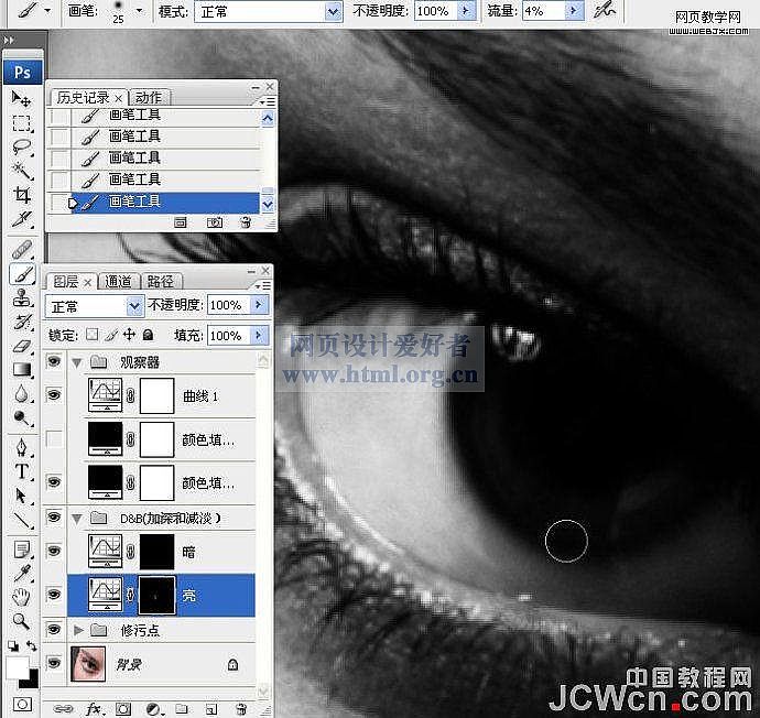 27、降低画笔流量,使用白色画笔涂抹眼白亮部区域,目的在于使黑白灰过度均匀。