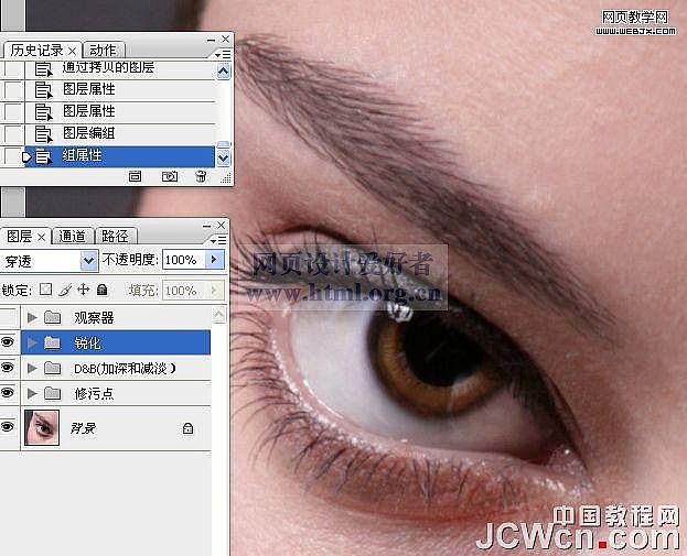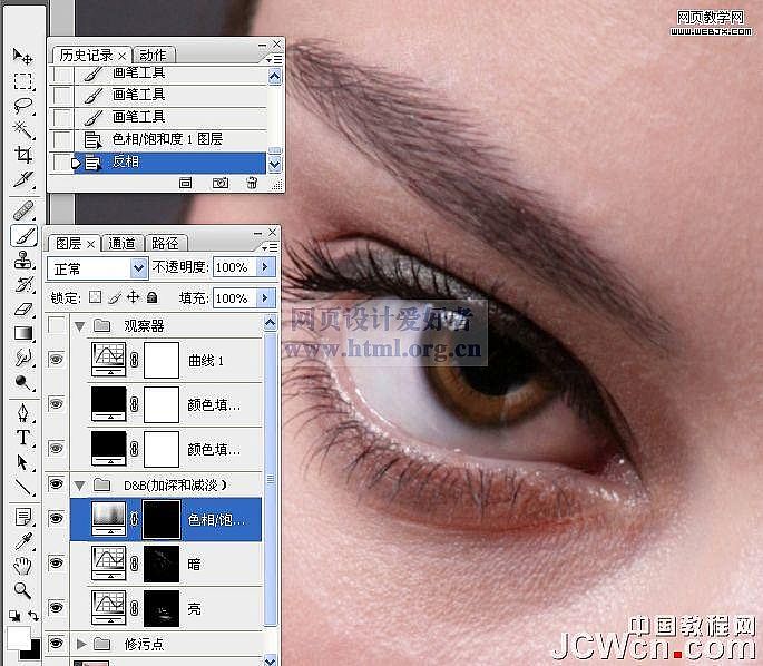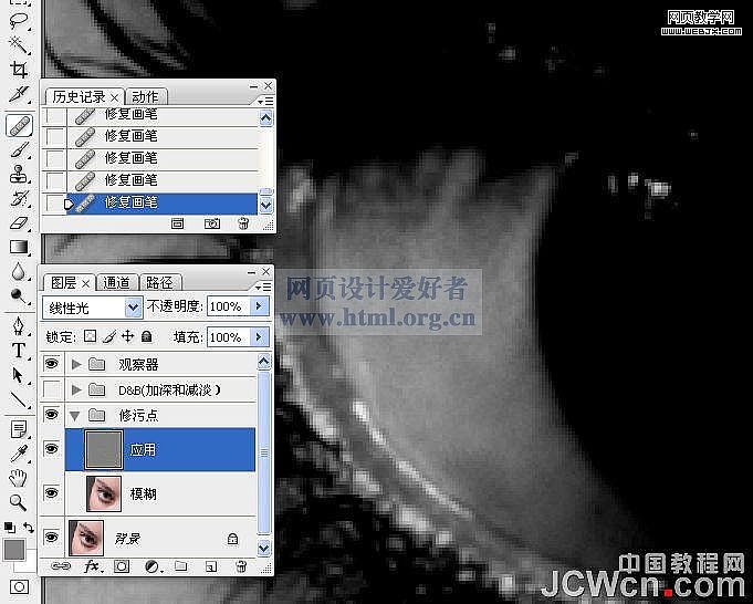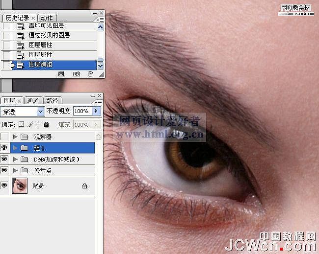 22、降低观察器图层的不透明度,选中应图层,使用“修复画笔工具”对右眼白进行处理。