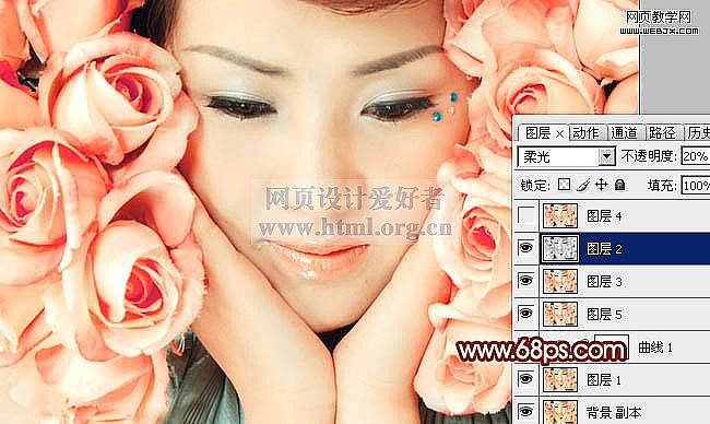 12、新建一个图层,盖印图层。按Ctrl + Shift + U 去色,图层混合模式改为“柔光”,不透明度改为:20%,效果如下图。