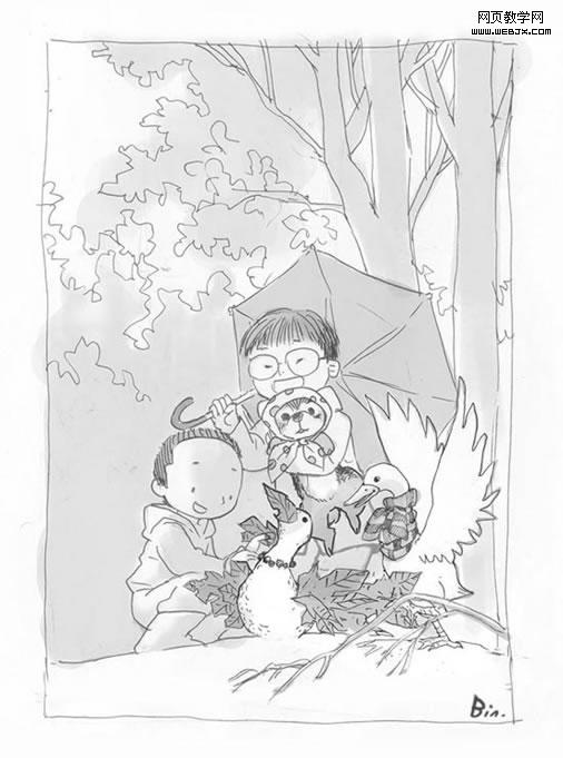 7、线稿成型后铺上大致的调子,终于,铅笔稿完成了!
