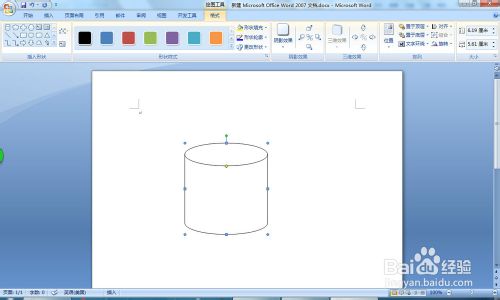 回到word编辑区,光标变成十字形,在空白处单击,按钮鼠标左键不放,拖动,释放鼠标,可以绘制出一个“圆柱形”;如下图