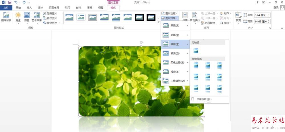 3、依次点击 “图片效果”下拉菜单-“映像”,找到并点击“无映像”,具体操作如下